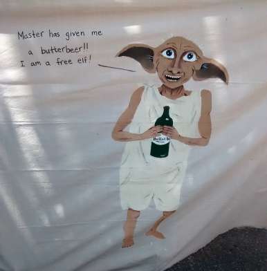 The sweet trolley came around, pushed by an affable ginger-haired young wizard; I couldn’t resist, and bought Scottish shortbread. There were also sugar quills and House badge biscuits on offer, and Butterbeer just across the Alley for thirsty muggles and wizards alike, not to mention house-elves. Dobby seemed to quite enjoy his.