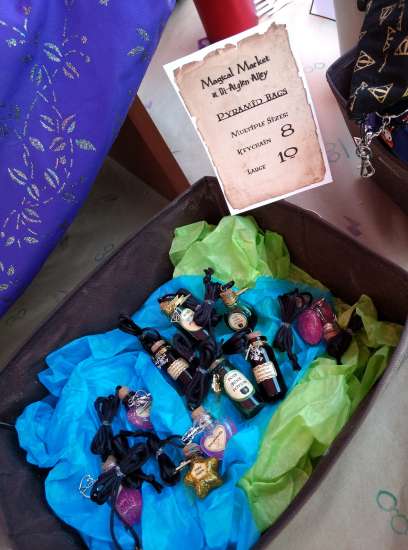 Nearby, a wand maker had a display of truly beautiful wands that he had carved by hand. There was dragon artwork, too. My favorite merchant was the glass-maker, who made all sorts of potion ingredient bottles!