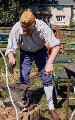 He was making various kinds of useful hooks out of iron, and when his hammer hit the hot metal just so, it rang with a bright, clear, penetrating sound that resounded – I could feel it in my body! I’ve watched blacksmiths before, but never heard or felt quite that musical a sound; maybe this man had particular skill. A gentleman who came up to buy some of the blacksmith’s handsome hardware said that he had dug up a number of just such hooks while restoring a historic house. History relives!